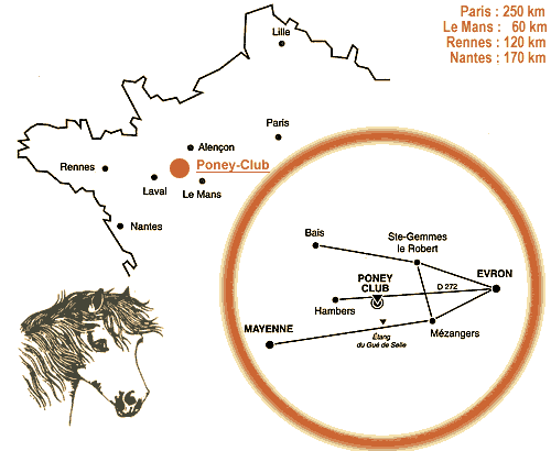 Le Poney-Club est situé à 2h30 de PARIS par l'autoroute A81 - PARIS-RENNES. Après LE MANS, prendre la sortie n°1, direction Ste-SUZANNE-ÉVRON. A Évron, prendre la direction MAYENNE et arrivée à MÉZANGERS, suivre le fléchage "Poney-club" à droite. Il se situe sur la D 272 après l'étang de Gué-de-Selle.
